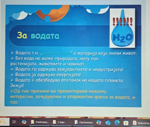 Заедно со учениците од I (прво) одд. од ПУ Караорман реализиравме еко час со содржина “Грижа за здравјето- Прочистување на вода” преку низа активности на самиот час ( проследување на презентација за важноста од чиста вода, споделување материјал потребен за активноста, преку слика на бел лист учениците даваат претпоставки за резултатите што ги очекуваат по проследување на самата активност и на крај ги споредуваат добиените резултати).Учениците дојдоа до заклучок дека нечистата вода може да се прочистува и дека чистата вода е важна за здравјето.