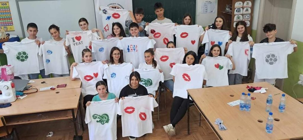 Редизајнирање на стара облека со техника “цртање со шаблон” – Учениците имаа можност да ги претворат старите парчиња облека во нови и уникатни дизајни користејќи шаблони и бои. Резултатите беа неверојатни и инспиративни!