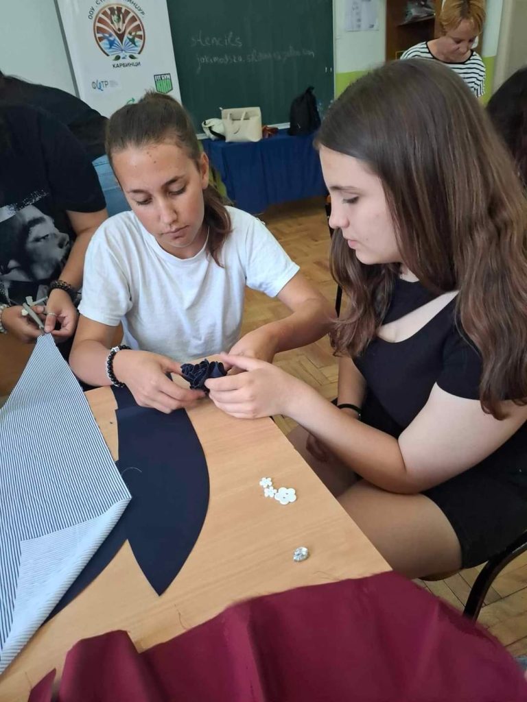 Дизајнирање на брошеви и украсни аксесоари од текстилен отпад – Во вториот дел од работилницата, учениците креираа прекрасни брошеви и декоративни аксесоари од текстилен отпад. Оваа активност не само што ги поттикна нивните креативни вештини, туку и ги подучи за важноста на рециклирањето и одржливоста.