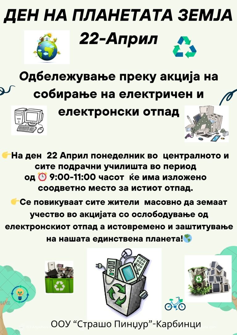 По повод 22 Април Ден на планетата Земја учениците од ЦУ Карбинци својот неупотреблив електричен и електронски отпад од своите домови го складираа во соодветни канти за истиот. Да ја…